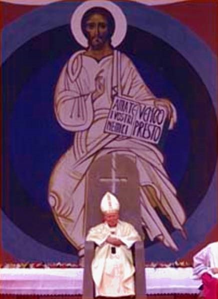 As you look closely at this picture, you simply cannot miss the blasphemous Satanic Inverted Cross behind the head of the seated Pontiff. In fact, this Inverted Cross is so jarring to my senses that I cannot look at it for more than a few moments before I have to look away. Of all the Satanic symbols, the Inverted Cross is the most cruel caricature of the true Cross of Calvary. I simply cannot stand the sight of the cross upon which my Savior died for my sins -- and yours -- turned upside down to depict Antichrist. Remember, the true definition of Antichrist is "he who comes in the guise of Christ". Make no mistake about the fact that the Inverted Cross predates that other Vatican symbol for Antichrist, the Twisted Crucifix, which this Pope has been using at every stop on this trip to the Middle East. -- Cutting Edge Ministries.