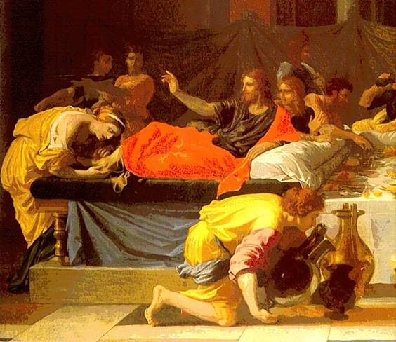 De acordo com os sinópticos, ficamos a saber que o anfitrião deste episódio era um fariseu de nome Simão com a alcunha de «leproso», seguramente por ser um antigo doente já curado por Jesus, razão pela qual existiria tamanha amizade entre ambos ao ponto de uma cena da maior importância mística como esta, se ter passado em sua casa. De acordo com João ficamos a saber que este era pai de Lázaro irmão de Marta & Maria. Que esta Maria era também a mesma que Maria Madalena ficamos a suspeita-lo precisamente pelo tratamento que Lucas deus a este episódio. A fama de adúltera desta santa seria já corrente à época da publicação do evangelho de Lucas ou trata-se de premeditada manipulação posterior?!